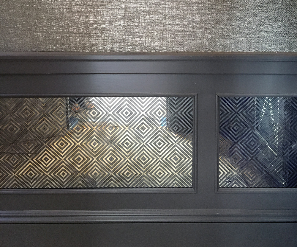 Detail of Powder Room Dado panels reverse gilded and engraved in 12K white gold leaf, with contemporary églomisé geometric pattern. Interior design by Rinfret, Ltd., Greenwich, CT.